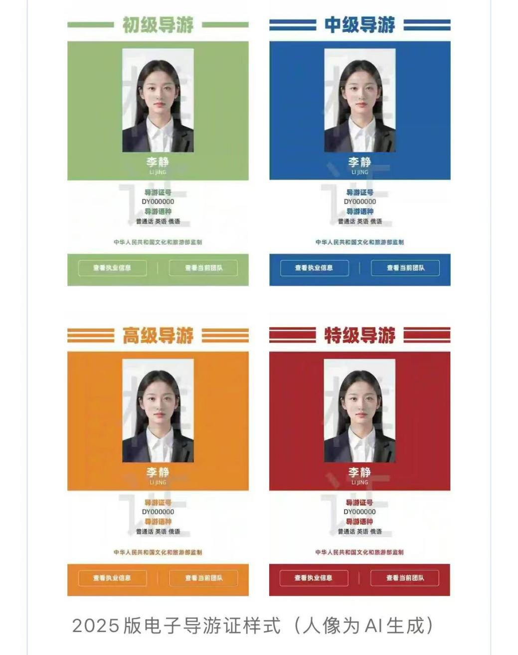 2025版電子導(dǎo)游證及導(dǎo)游身份標(biāo)識(shí)卡均采取豎版證件樣式,證件主色調(diào)按照導(dǎo)游等級(jí)進(jìn)行區(qū)分,初級(jí)導(dǎo)游為綠色、中級(jí)導(dǎo)游為藍(lán)色、高級(jí)導(dǎo)游為橙色、特級(jí)導(dǎo)游為紅色。